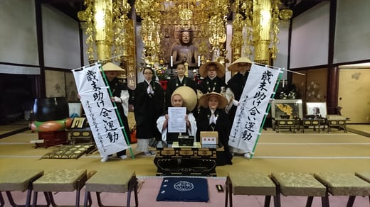 皆さんと、到岸寺山門前にて托鉢を行いました。